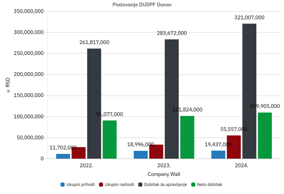 Dunav društvo za upravljanje dobrovoljnim penzijskim fondovima ima stabilan rast ukupnih prihoda u tri godine od 2022. do 2024. sa 11,7 na 19,5 miliona dinara, mada ukupni rashodi rastu bržim tempom i višestruko nadilaze ukupne prihode. Za dve godine su udvostručeni na 55 miliona dinara u 2024. godini.