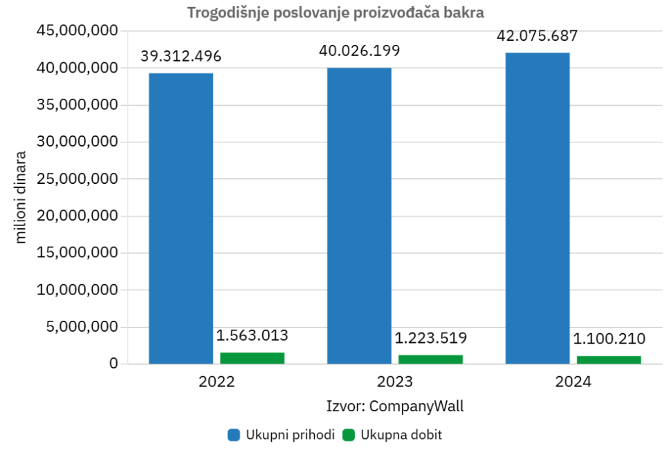 Sličan obrazac prati i kretanje dobiti. Ukupna dobit proizvođača bakra opala je sa oko 1,56 milijardi dinara u 2022. na 1,22 milijarde u 2023, da bi u 2024. dodatno pala na približno 1,1 milijardu dinara. Pad dobiti je, dakle, proporcionalan smanjenju prihoda, što ukazuje na to da kompanije nisu uspele da kompenzuju pad prihoda kroz smanjenje troškova ili povećanje efikasnosti.