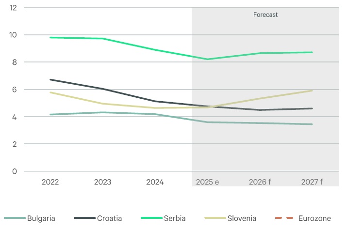 Uprkos lokalnim i širim političkim i ekonomskim izazovima, Srbija je zadržala, iako usporenu, putanju rasta. Procena Oxford Economics-a za BDP Srbije u 2025. godini povećana je na 1,9 odsto na godišnjem nivou, zahvaljujući povoljnijim ekonomskim pokazateljima u poslednjim mesecima. Prema podacima Republičkog zavoda za statistiku, inflacija je u decembru iznosila 2,7 odsto na godišnjem nivou, nakon ranijeg rasta tokom godine.