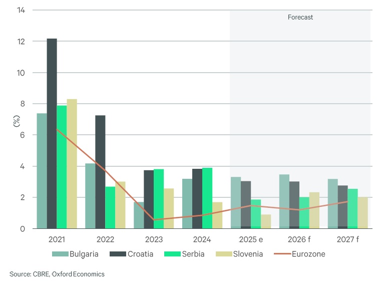 Očekuje se da će evropska ekonomija ove godine ostvariti skroman rast, pri čemu se predviđa da će BDP evrozone porasti za skoro 1,0 odsto. To predstavlja usporavanje u odnosu na 2025. godinu, koje je delimično posledica kontinuiranog uticaja carina, za koje se očekuje da će snažnije pogoditi ekonomsku aktivnost u 2026. nego prethodne godine. Učinak će varirati među tržištima, pri čemu se za pojedine ekonomije prognozira slabiji rast, ocenjuju analitičari kompanije CBRE u svom godišnjem izveštaju „SEE Region Real Estate Market Outlook 2026“.