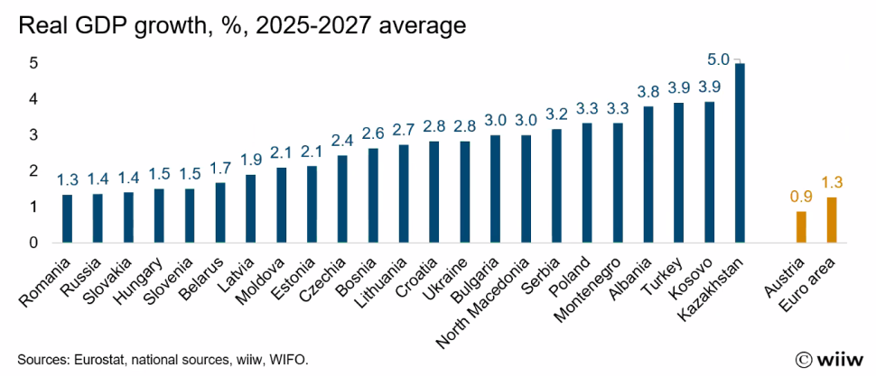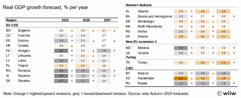 Sve u svemu, Bečki institut prognozira prosečan rast od 2,2 odsto za države članice EU u regionu u 2025, što je minimalna revizija naniže od 0,1 procentnog poena u poređenju sa letom. U 2026. bi trebalo da se ubrza na 2,6 odsto – ponovo blaga revizija naniže, ovog puta od 0,2 procentna poena. To znači da će ove zemlje verovatno nastaviti svoj proces ekonomskog sustizanja i ove i sledeće godine, rastući znatno brže od evrozone (2025: 0,9 odsto; 2026: 1,4 odsto).