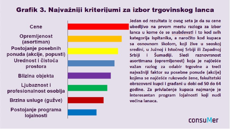 Ključni kriterijumi koji po opadajućem značaju opredeljuju izbor trgovinskog lanca su opremljenost i raznovrsnost u ponudi različitih brendova, akcije i popusti, urednost i čistoća prostora, blizina objekta i ljubaznost i profesionalnost osoblja.