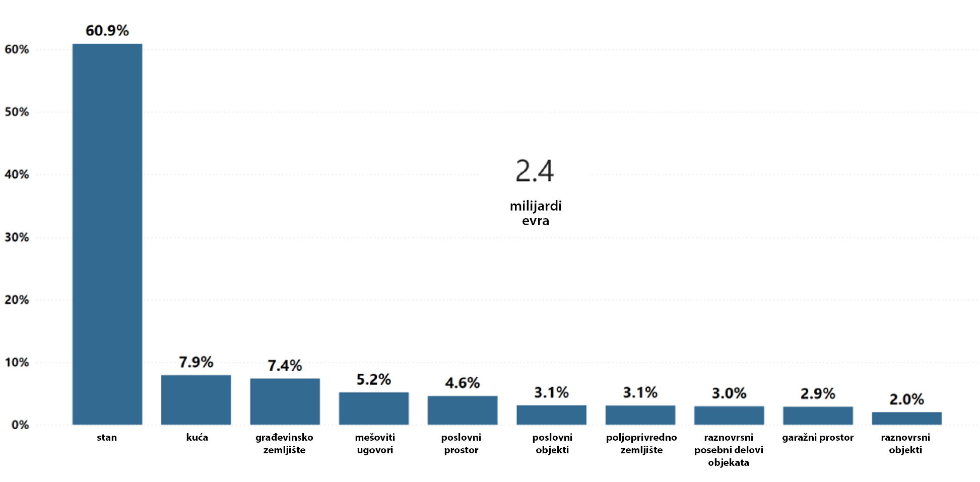 Kako pokazuje izveštaj RGZ-a, za kuće je izdvojeno 189 miliona evra (osam odsto ukupne vrednosti), za građevinsko zemljište 176 miliona evra (sedam odsto), za poslovne prostore 109 miliona evra (pet odsto), za poljoprivredno zemljište 73 miliona evra (tri odsto ukupne vrednosti).