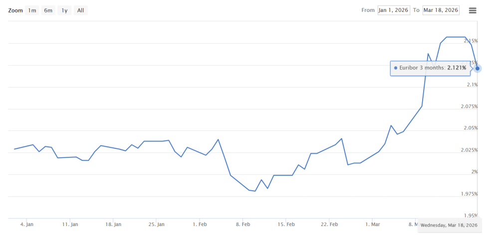 Od izbijanja sukoba na Bliskom istoku primetan je rast i tromesečnog i šestomesečnog euribora. Tako je tromesečni euribor prema poslednjim podacima (18. marta) iznosio 2,121 odsto, dok je početkom godine bio 2,029. Šestomesečni euribor u istom periodu zabeležio je vrednost od 2,309 u martu, dok je u januaru iznosio 2,105 odsto. Podaci pokazuju da je od početka godine tromesečni euribor porastao za oko 4,54 odsto, a šestomesečni za oko 9,69 odsto.