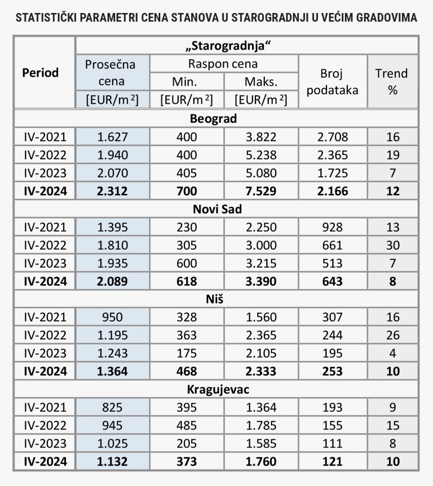 Na prvom mestu po cenama kvadrata u starogradnji nalazi se Beograd, sa prosečnom cenom od 2.312 evra, minimalnom cenom od 700 evra i maksimalnom od 7.529 evra.