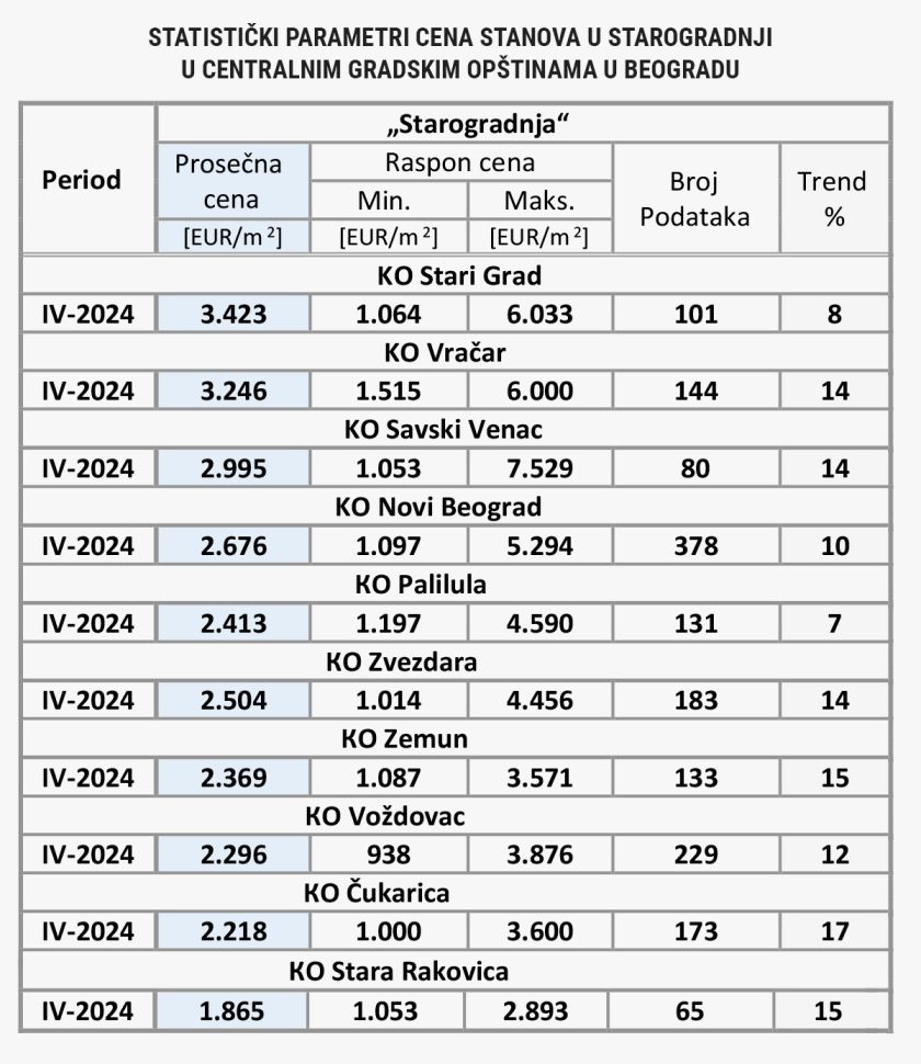 Raspon cena koje se mogu naći u izveštaju RGZ-a je šarolik, pa je tako u četvrtom kvartalu 2024. najjeftinija starogradnja na Vračaru koštala 1.515 evra po kvadratu, na Novom Beogradu 1.097 evra, Zvezdari 1.014 evra, a na Savskom vencu 1.053 evra.