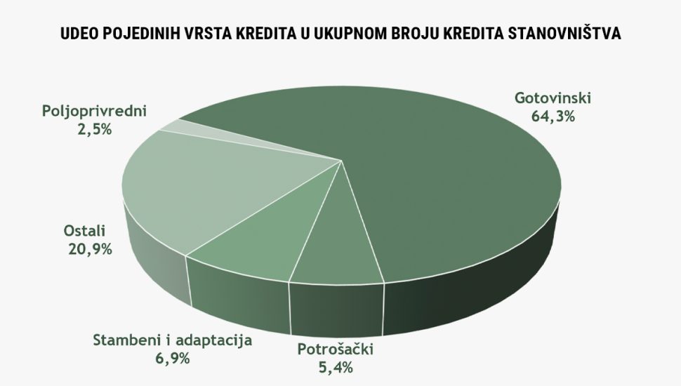 Najveći udeo u ukupnim kreditima stanovništvu imali su gotovinski – 64,3 odsto. Tako su građani na ime ovih pozajmica dugovali 946,03 milijarde dinara, što je za 21,3 odsto više nego u decembru 2024. godine.