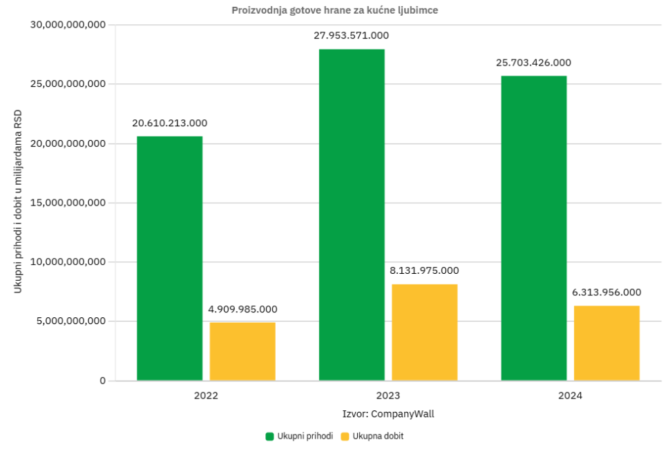 Prema podacima bonitetne kuće CompanyWall, među proizvođačima gotove hrane za kućne ljubimce u Srbiji je registrovano 69 firmi, čiji su ukupni prihodi u 2024. godini iznosili više od 25,5 milijardi dinara (25.703.426.000), i oni su u padu za oko dve milijarde dinara u odnosu na 2023.
