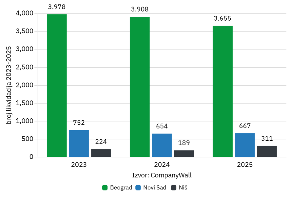 Kada je reč o broju ugašenih firmi, Beograd beleži konstantno visok nivo, ali uz blagi pad tokom posmatranog perioda. Sa 3.978 likvidacija u 2023. godini broj je smanjen na 3.908 u 2024, a zatim značajnije na 3.655 u 2025. godini.