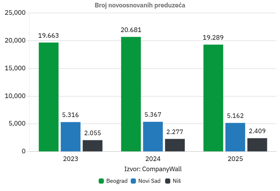 Novi Sad pokazuje stabilniji trend. Broj novoosnovanih firmi raste sa 5.316 u 2023. na 5.367 u 2024, a zatim blago opada na 5.162 u 2025. godini. U odnosu na broj stanovnika, Novi Sad beleži oko 13,87 novih firmi na 1.000 stanovnika u 2025, što ga svrstava na prvo mesto po intenzitetu poslovne aktivnosti.