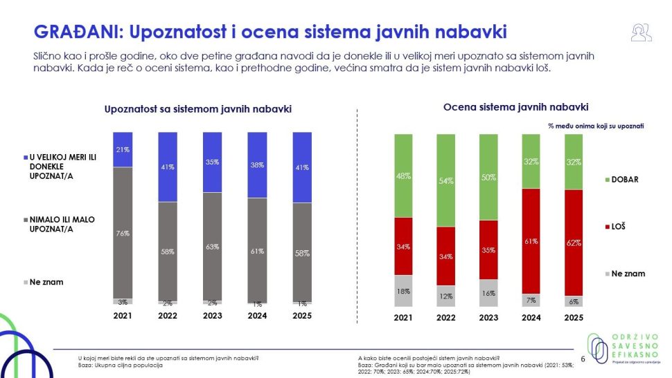 Istraživanje pokazuju da 41 odsto građana smatra da je donekle ili u velikoj meri upoznato sa procesima javnih nabavki, dok 62 odsto loše ocenjuje sistem javnih nabavki.