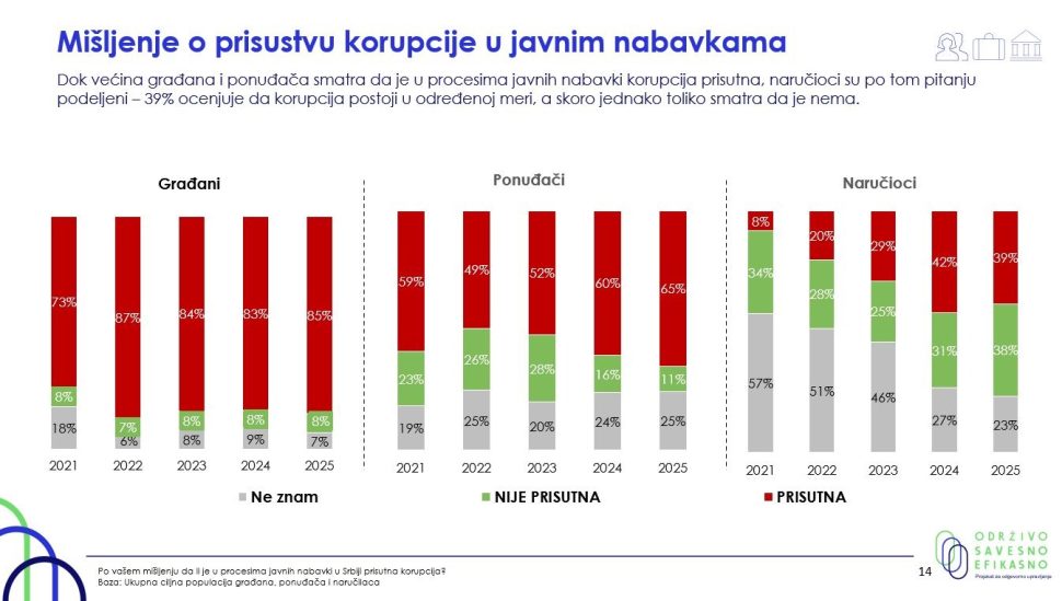 Čak 85 odsto građana veruje da je korupcija prisutna u javnim nabavkama, a isto mišljenje deli i 65 odsto ponuđača. Kod naručilaca su stavovi podeljeni – 39 odsto smatra da korupcija postoji u određenoj meri, dok 38 odsto veruje da je nema.