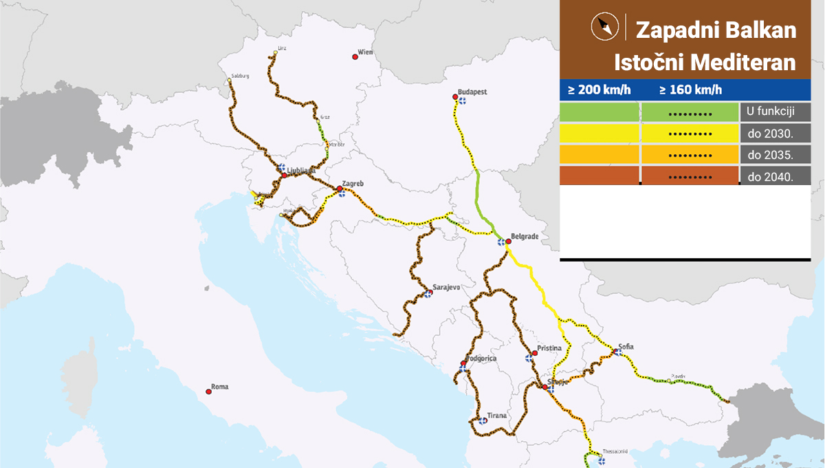 Rok za železničku vezu između Beograda i Zagreba je (tek) 2035. godina, a za glavni grad Slovenije daleka 2040. godina. Ovi vozovi trebalo bi da idu brzinom od 160 km/h, ali u pojedinim delovima i do 200 km/h. Do glavnog grada Hrvatske stizaće se za četiri sata, a do Ljubljane za pet sati.