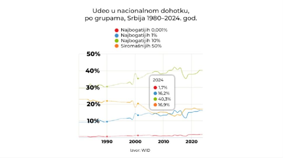 „Ako odemo korak dalje, jedan odsto najbogatijih prihoduje praktično koliko i siromašnija polovina stanovništva, više od 16 odsto ukupnog dohotka“, objašnjava Simović, koji je programski koordinator Centra za politike emancipacije.