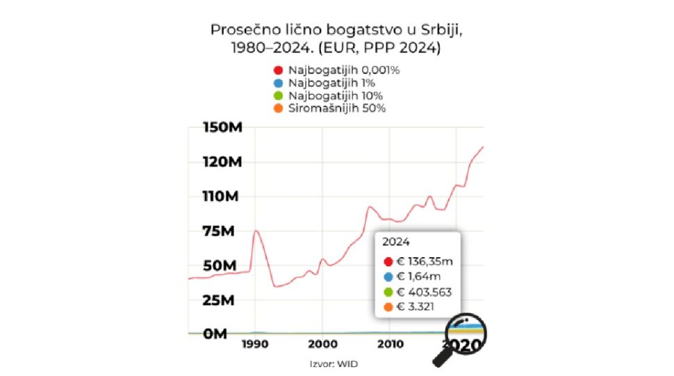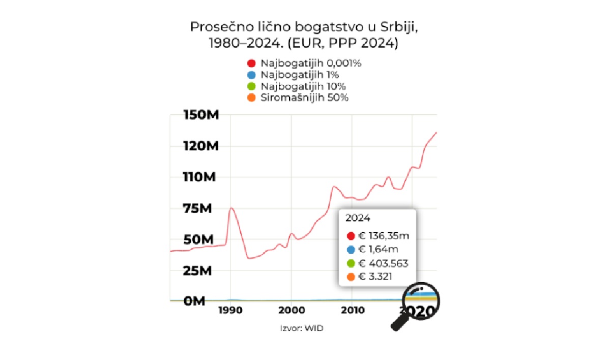 Ako ove brojke prebacimo u novac, vidimo da 0,001 odsto najbogatijih (50 ljudi) u Srbiji u proseku poseduje po više od 136 miliona evra, dok je prosečno bogatstvo siromašnije polovine (oko 2,75 miliona odraslih) tek nešto oko 3.300 evra, pokazuju podaci Svetske baze o nejednakosti (World Inequality Database)