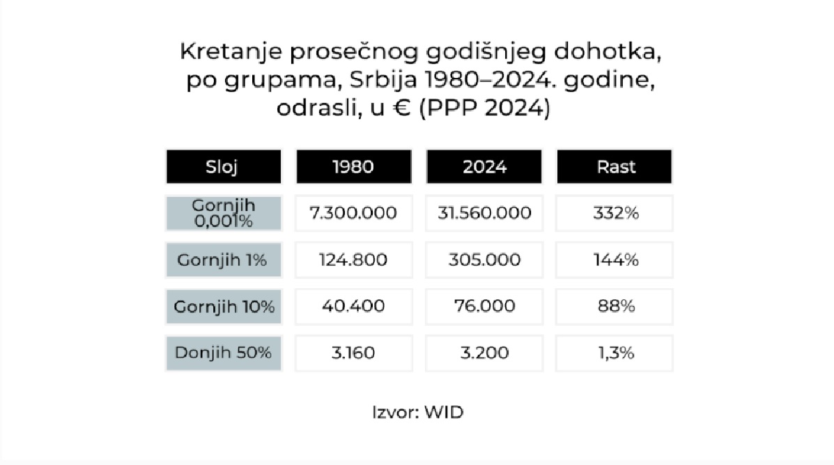 Podaci koje je, na osnovu ove baze, za Biznis.rs izračunao sociolog Vladimir Simović ukazuju da je u prethodnih četrdesetak godina prihod 50 najbogatijih u Srbiji porastao za 332 odsto, a siromašnije polovine tek za 1,3 odsto.