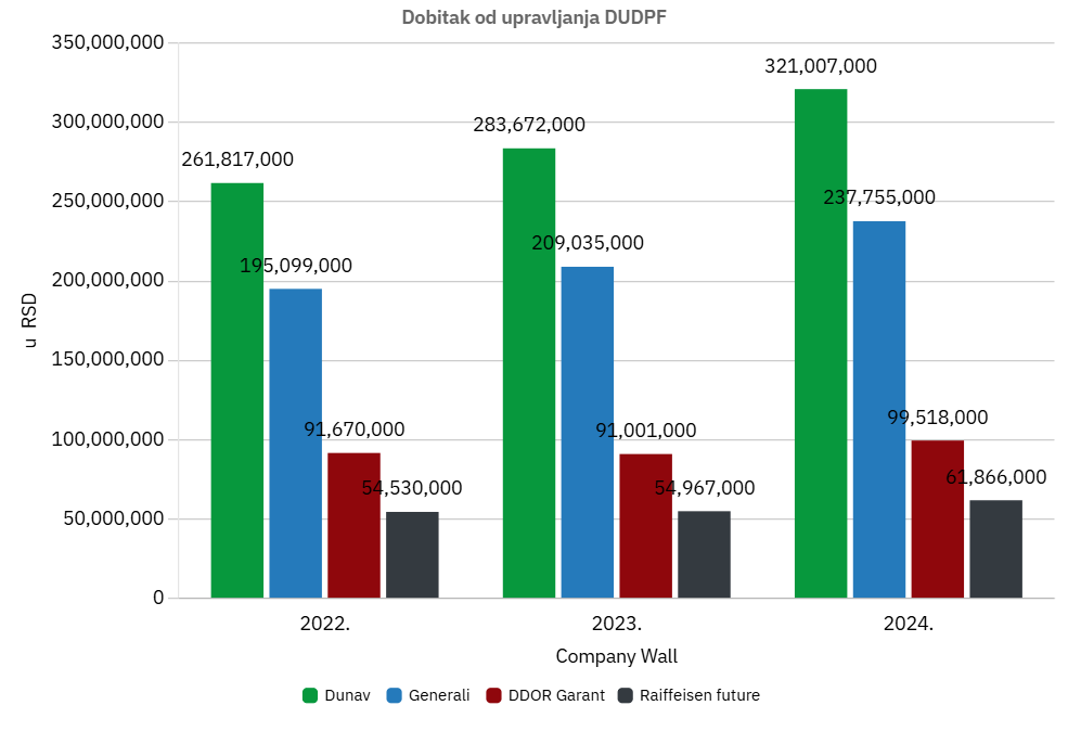 Društvo za upravljanje dobrovoljnim penzijskim fondovima Dunav je u 2024. godini uknjižilo 321 milion dinara po osnovu dobitka za upravljanje, ali je čist profit iznosio 110 miliona dinara, pokazuju podaci bonitetne kuće CompanyWall.