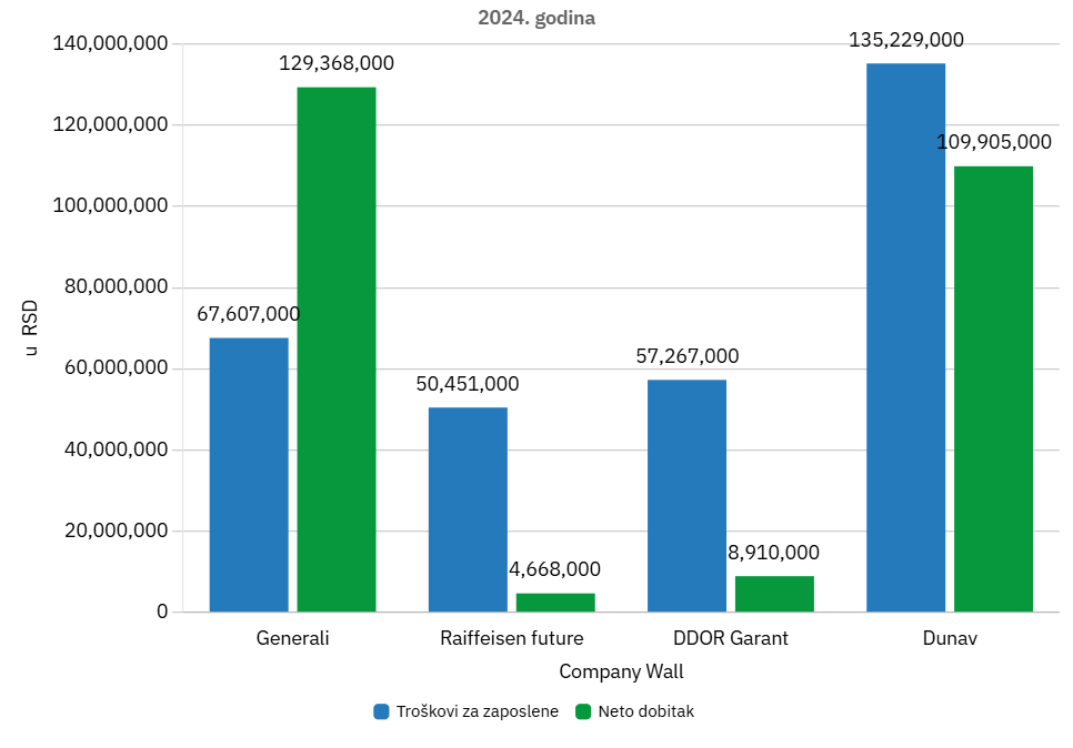 Takav zaključak proizilazi iz činjenice da je Generali za trošak zarada, naknada zarada i druge lične rashode za 62 zaposlena izdvojio nešto manje od 68 miliona dinara, dok je istovremeno Dunav za 37 zaposlenih imao dvostruko veći trošak – 135 miliona dinara.