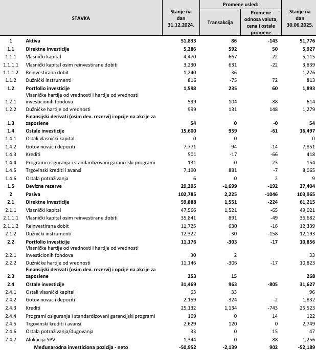 Strana neto finansijska pasiva Srbije na kraju prvog polugodišta 2025. godine iznosila je 104 milijarde evra, što je za 1,2 milijarde više nego na kraju 2024. godine. Najveći porast zabeležen je kod stranih direktnih investicija nerezidenata u Srbiju, koje su u prvom polugodištu povećane za 1,3 milijarde evra, na 61,2 milijarde evra, čime je njihovo učešće u ukupnoj pasivi povećano na 58,9 odsto u odnosu na 58,3 odsto na kraju 2024. godine.