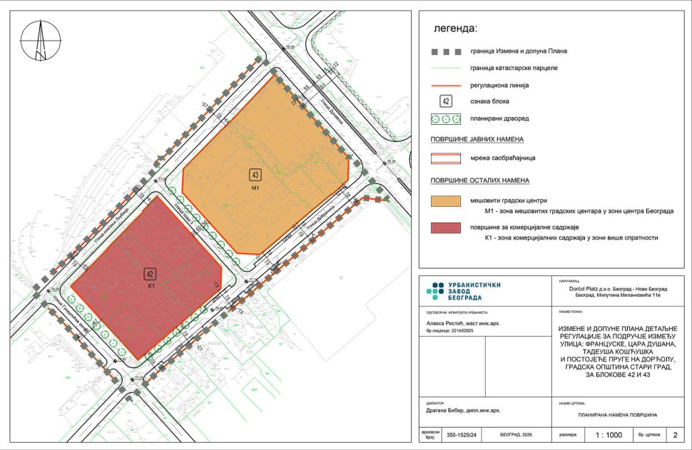 Sekretarijat za urbanizam i građevinske poslove Gradske uprave Beograda stavio je na javni uvid Nacrt izmena i dopuna plana detaljne regulacije za deo Dorćola koji obuhvata prostor između Francuske ulice, Cara Dušana, Tadeuša Košćuška i postojeće pruge, u opštini Stari grad. Izmene se odnose na blokove 42 i 43, a naručilac izrade izmena i dopuna plana je Dorćol Platz d.o.o. Beograd.