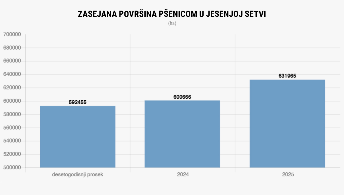 U Srbiji je tokom 2025. godine u jesenjoj setvi zasejano ukupno 842.347 hektara, što je 5,5 odsto više u odnosu na jesenju setvu 2024. Pšenica i dalje zauzima dominantnu površinu, dok su pojedine kulture, poput ovsa, zabeležile blagi pad.