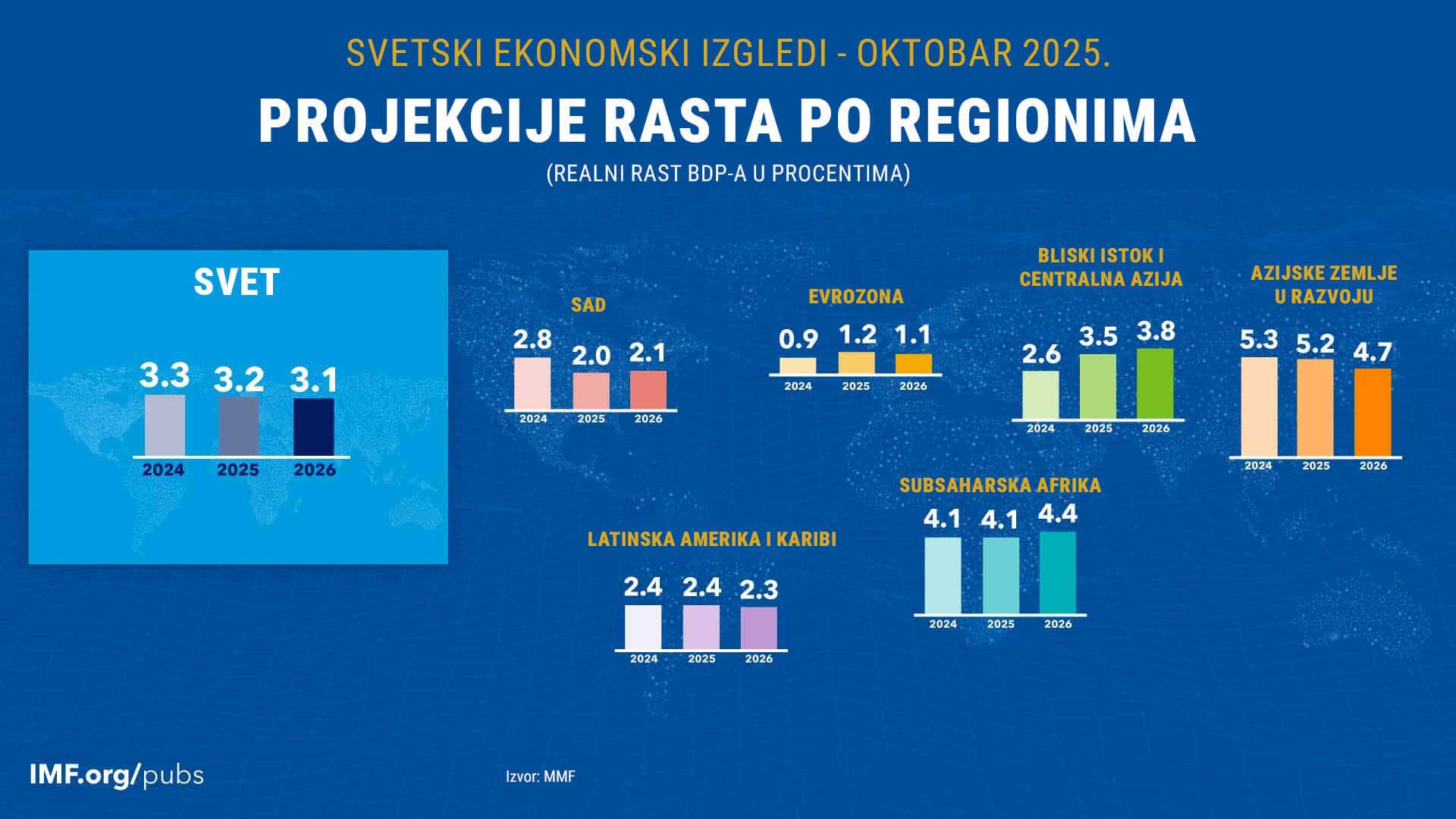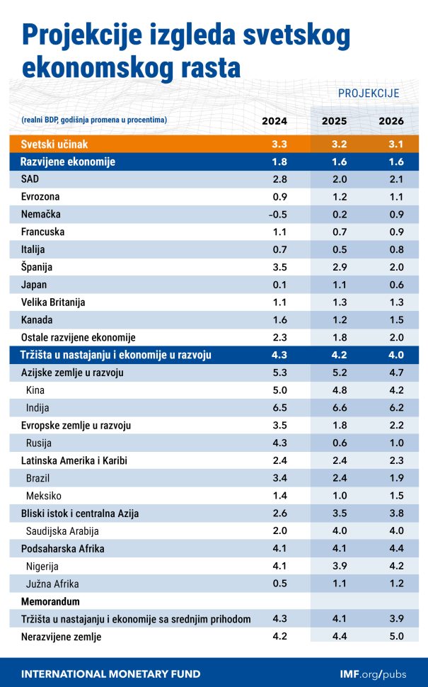 Izveštaj je predstavljen protekle nedelje, neposredno pred početak godišnjeg zasedanja Međunarodnog monetarnog fonda i Svetske banke u Vašingtonu. Prema njemu, globalni rast će usporiti sa 3,3 odsto u 2024. na 3,2 odsto u 2025. i 3,1 odsto u 2026. godini. Napredne ekonomije očekuje rast od oko 1,5 odsto, dok bi zemlje u razvoju i tržišta u usponu trebalo da zabeleže rast nešto iznad četiri procenta.