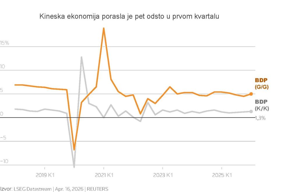 Kada je reč o ostalim pokazateljima, industrijska proizvodnja porasla je 5,7 procenata u martu na godišnjem nivou, zahvaljujući jakoj globalnoj tražnji za kineskom elektronikom, automobilima, poluprovodnicima i robotikom. S druge strane, maloprodaja je porasla 1,7 odsto, što je slabije od očekivanja i odražava slabu domaću potrošnju.